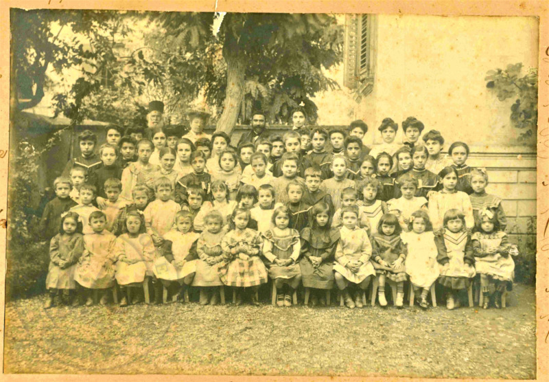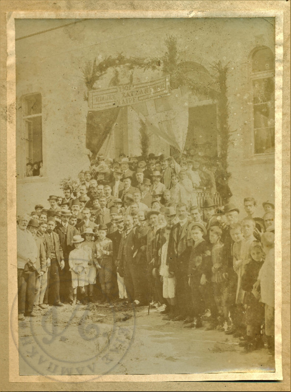 Ομαδική μικτού δημοτικού σχολείου. Στην φωτογραφία βρίσκεται ο Γεώργιος Λαμπάκης με την σύζυγό του Ευθαλία. (Τελευταία σειρά από το κέντρο λίγο πιο αριστερά)