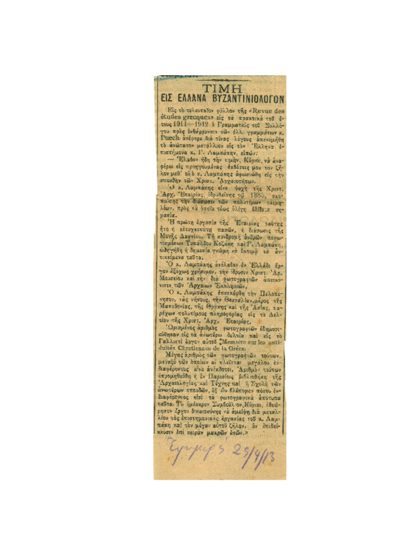Άρθρο στην εφημερίδα ''Εφημερίς'' για την βράβευση του Γεωργίου Λαμπάκη για το έργο του στην Βυζαντινή Αρχαιολογία και Χριστιανική Αρχαιολογική εταιρία.