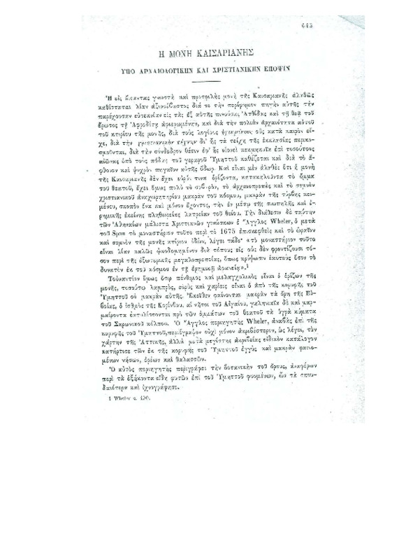 Μελέτες: "Η Μονή Καισαριανής - Υπό Αρχαιολογικήν και Χριστιανικήν άποψιν"