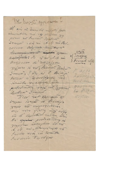 Προσχέδια επιστολής που διαψεύδει χρηματοδότηση της Βασίλισσας και των Ιατρών της Θεσσαλίας που επισκέπτονταν του πρόσφυγες, από τον Ρώσικο Ερυθρό Σταυρό.