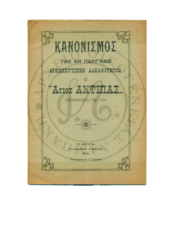 Κανονισμός της εν Περγάμω θρησκευτικής αδελφότητας ο "Άγιος Αντύπας"