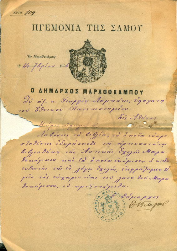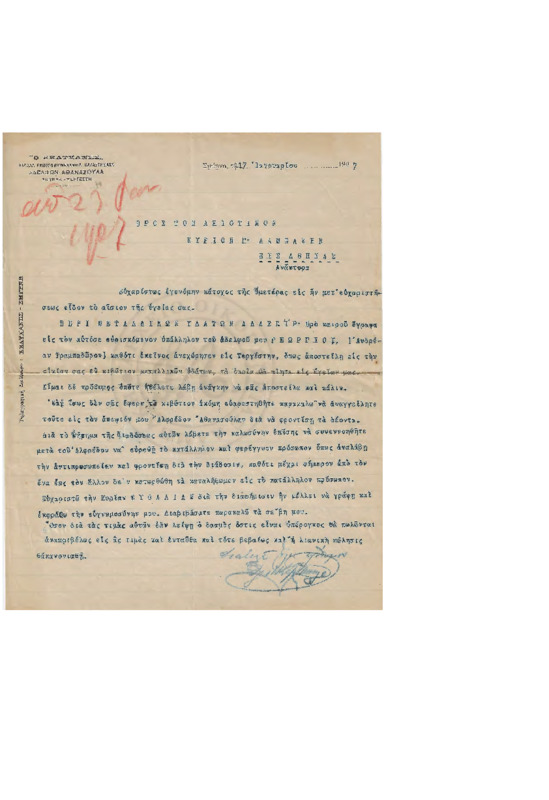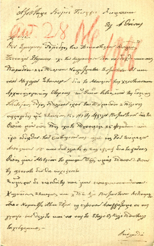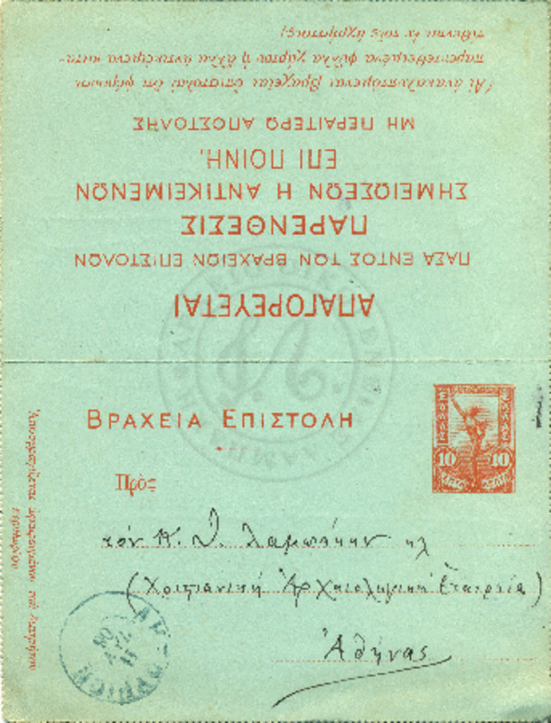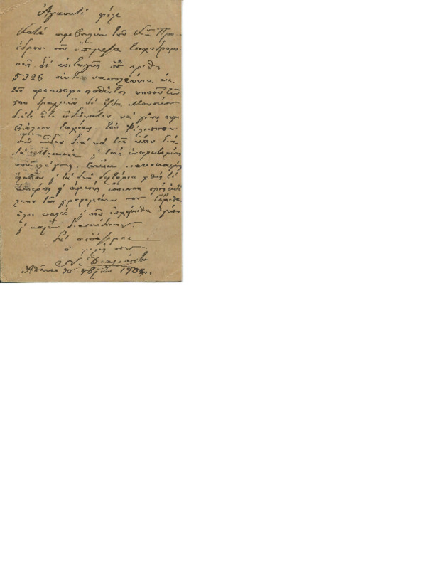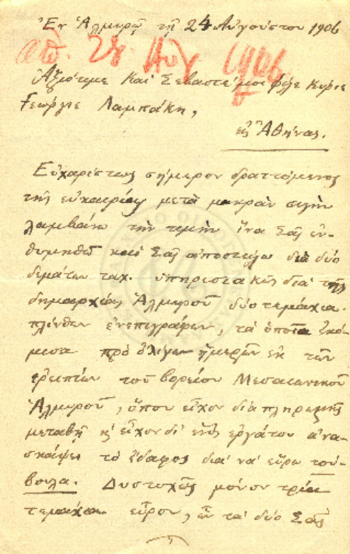 Ενημερώνει τον Γεώργιο Λαμπάκη για ευρήματα επιγραφών αρχαιολογικής αξίας τα οποία και του στέλνει για το μουσείο της Χριστιανικής Αρχαιολογικής εταιρίας.